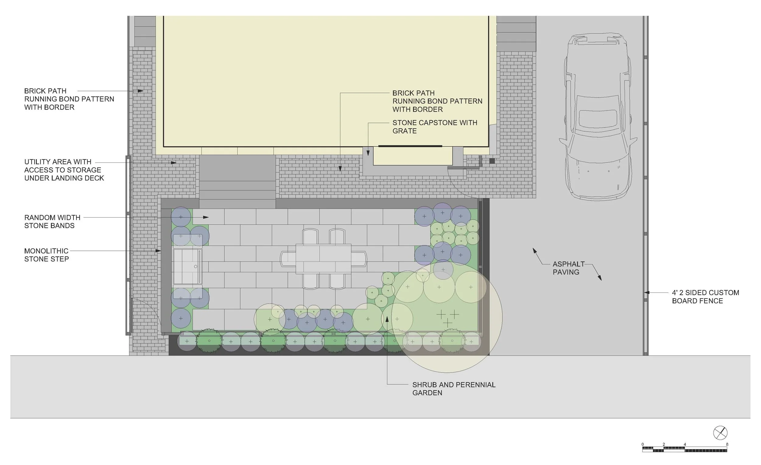 Maximizing the useable space for this young family was the design driver for the rehabilitation of this North Cambridge landscape. The garden uses lower maintenance plants to create a cohesive planted frame around the banded bluestone terrace. The window well has been covered with a grate to maximize safety and usability and the new shadow box fence creates privacy while still allowing air to move through the garden